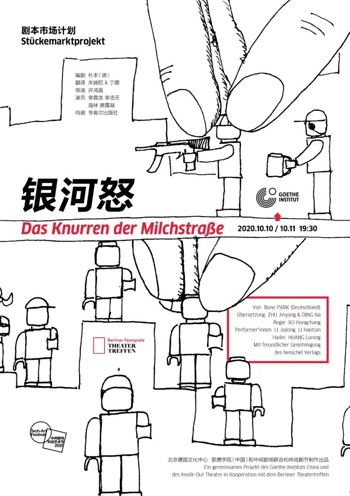 Das Projekt begann im Juli 2020 mit einem Workshop zum „Stückemarkt“ des Berliner Theatertreffens, in dessen Rahmen chinesische Regisseur*innen und Dramaturg*innen eingeladen wurden, sich mit den Autor*innen und Jurymitgliedern des „Stückemarkts“ des Berliner Theatertreffens auszutauschen und die beiden oben genannten Stücke zu diskutieren. Nach dem Workshop haben die Teilnehmenden ihre jeweiligen Konzepte für szenische Lesungen/Inszenierungen der Stücke eingereicht. Das Konzept für Das Knurren der Milchstraße von Xu Hongchang und der Inszenierungsvorschlag für 1 yottabyte leben von Wang Guanghao und Mo Zita wurden für die Umsetzung im Herbst 2020 ausgewählt. Sie werden im Rahmen des „Tech-Art Festival“ jeweils am 10. und 11. Oktober im Goethe-Institut in Peking und am 24. und 25. Oktober im Inside-Out Theatre als Work-in-Progress präsentiert.pened in a totalitarian system.
